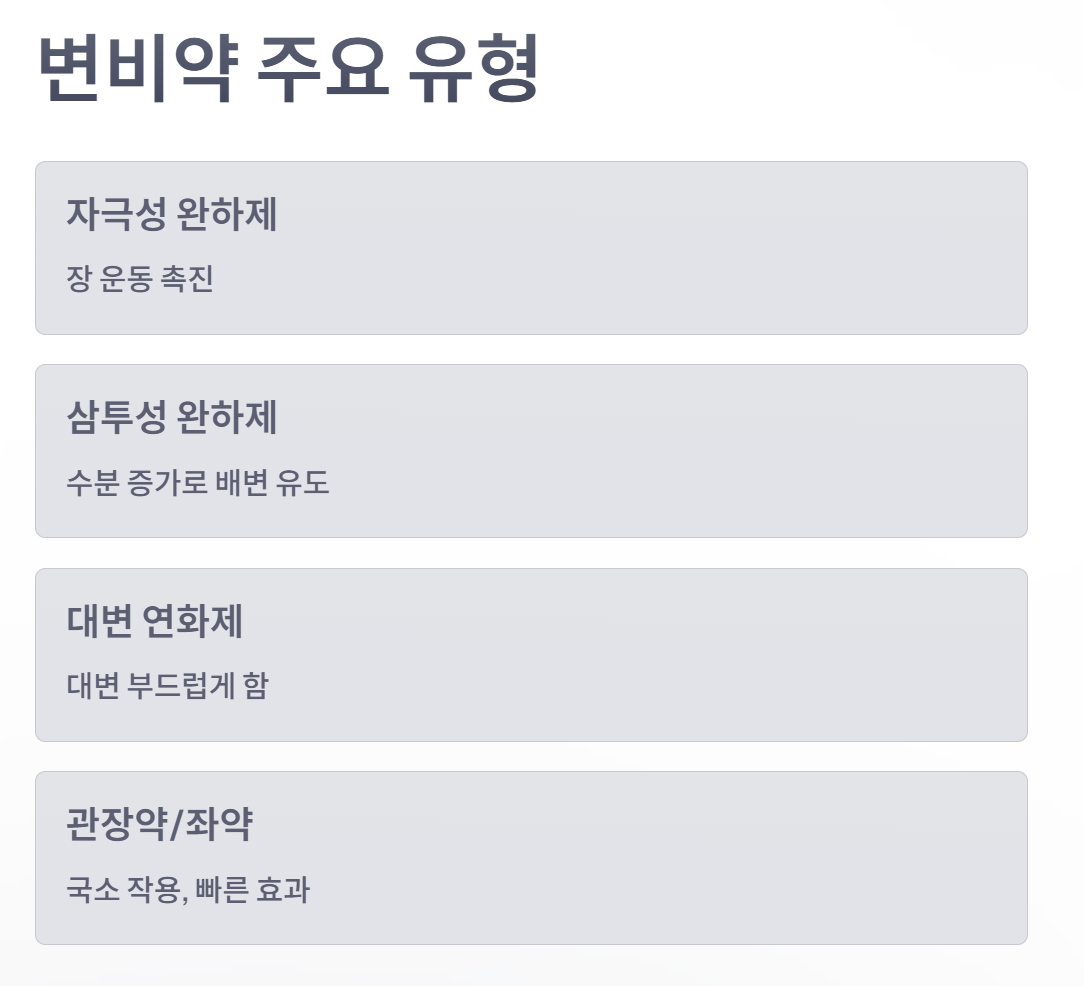변비약은 크게 아래 네 가지로 구분할 수 있어요. 실제 제품명과 함께 장단점을 살펴봅니다.