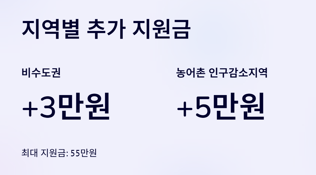 - 농어촌 인구감소지역: 위 금액 +5만 원 추가 (최대 55만 원)
