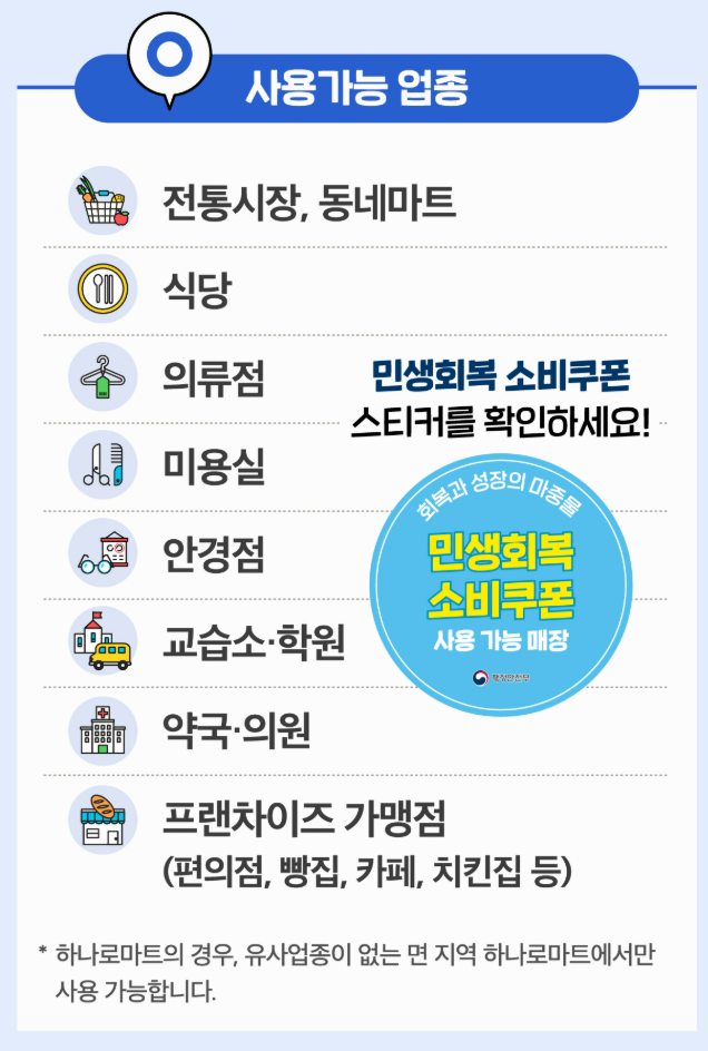 - 사용 가능처: 주민등록상 주소지 내 연 매출 30억 원 이하 소상공인 매장